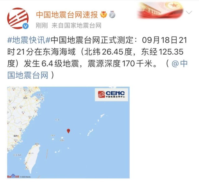 中國地震臺(tái)網(wǎng)正式測(cè)定:09月18日21時(shí)21分在東海海域(北緯26.45度,東經(jīng)125.35度)發(fā)生6.4級(jí)地震,震源深度170千米。