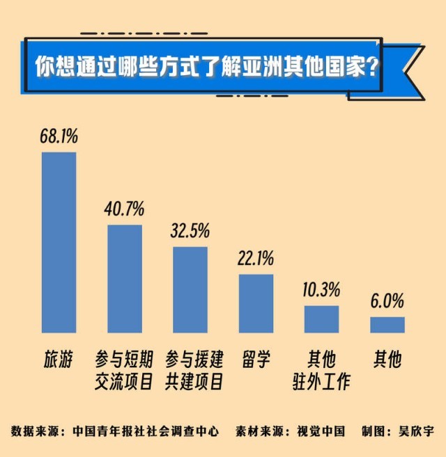 你會(huì)通過(guò)什么方式了解亞洲?68.1%的受訪者選擇了旅游,40.7%的受訪者選擇參與短期交流項(xiàng)目,32.5%的受訪者選擇參與援建共建項(xiàng)目,其他還有留學(xué)(22.1%)、駐外工作(10.3%)。