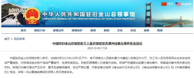 中國(guó)駐舊金山總領(lǐng)館發(fā)言人就總領(lǐng)館館舍遭沖闖襲擊事件發(fā)表談話