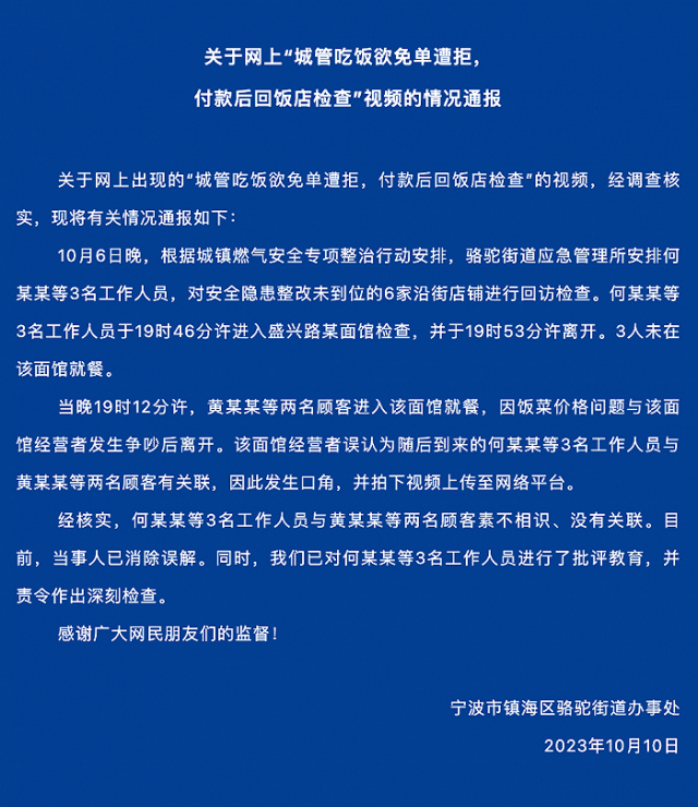 網(wǎng)傳“城管吃飯欲免單遭拒后回飯店檢查”,官方通報(bào)
