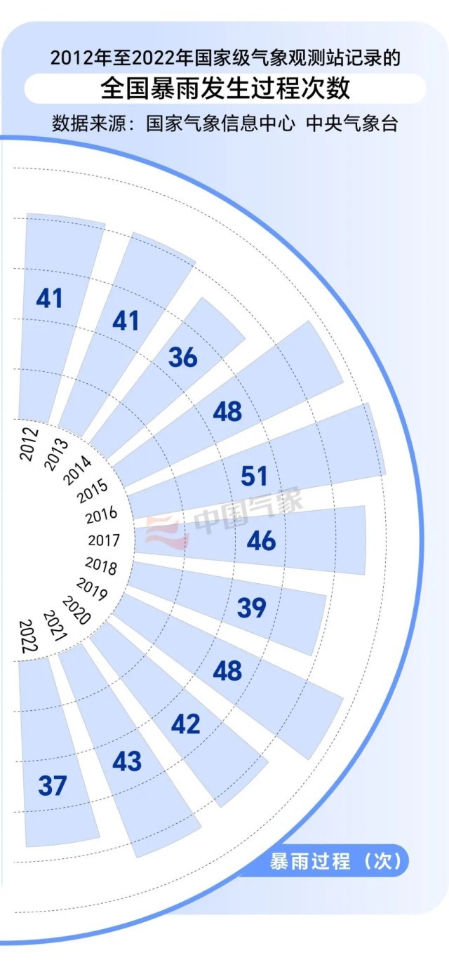 我們通過數(shù)據(jù)了解下我國(guó)近年來的暴雨發(fā)生頻次。2012年至2022年間,我國(guó)共發(fā)生暴雨天氣過程472次,年均發(fā)生次數(shù)約為42.9次;2016年暴雨發(fā)生次數(shù)最多,為51次;2014年最少,為36次(2023年未結(jié)束,暫不計(jì))。