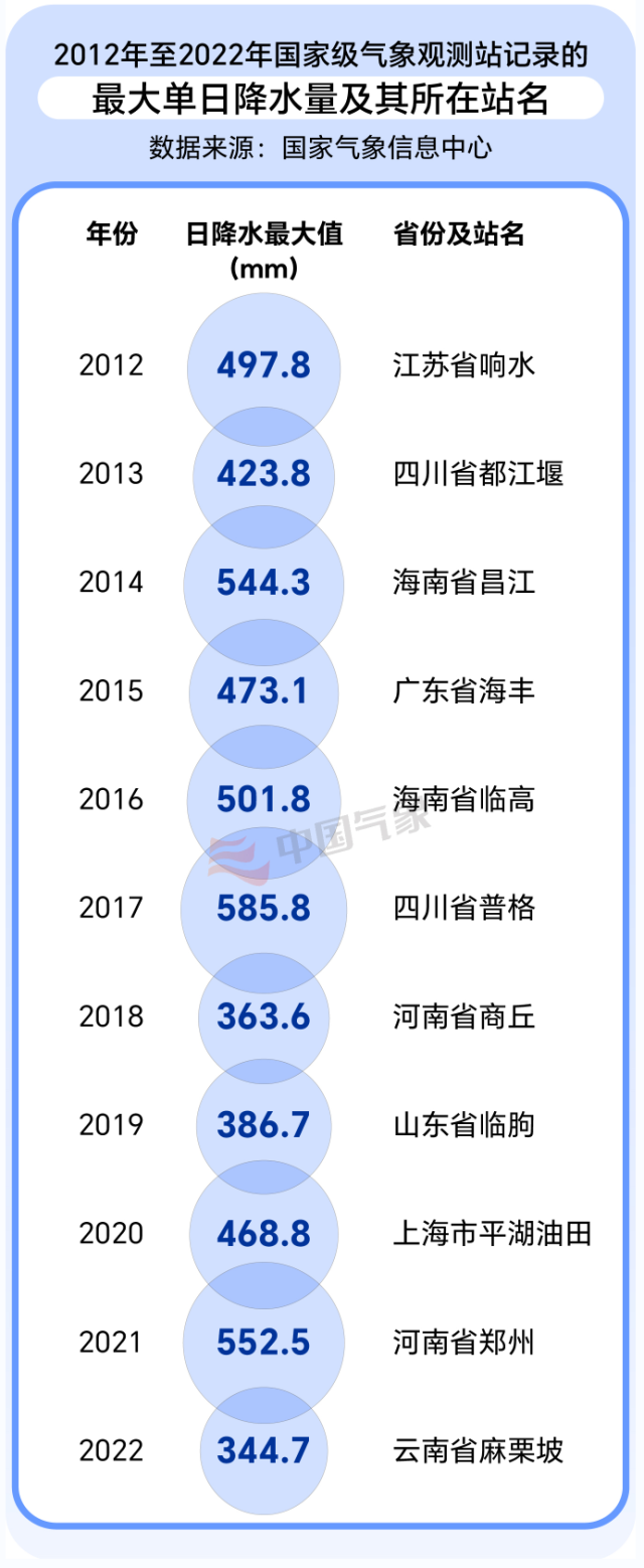 那么,近年來的單日最大降水量又是如何變化的呢?據(jù)國(guó)家氣象信息中心數(shù)據(jù)顯示,2012年至2022年,我國(guó)日降水量最大值分別出現(xiàn)在江蘇響水、四川都江堰、海南昌江、廣東海豐、海南臨高、四川普格、山東臨朐、上海平湖油田、河南鄭州、云南麻栗坡。