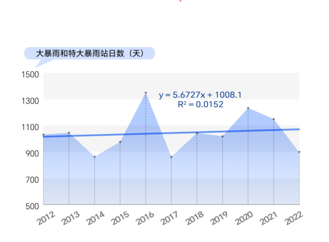數(shù)據(jù)統(tǒng)計(jì)顯示,2012年至2022年,我國(guó)暴雨站日數(shù)有明顯的增加趨勢(shì)。這意味著,2012年到2022年,我國(guó)暴雨天氣過程的持續(xù)時(shí)間或影響范圍有增加(擴(kuò)大)的趨勢(shì)。