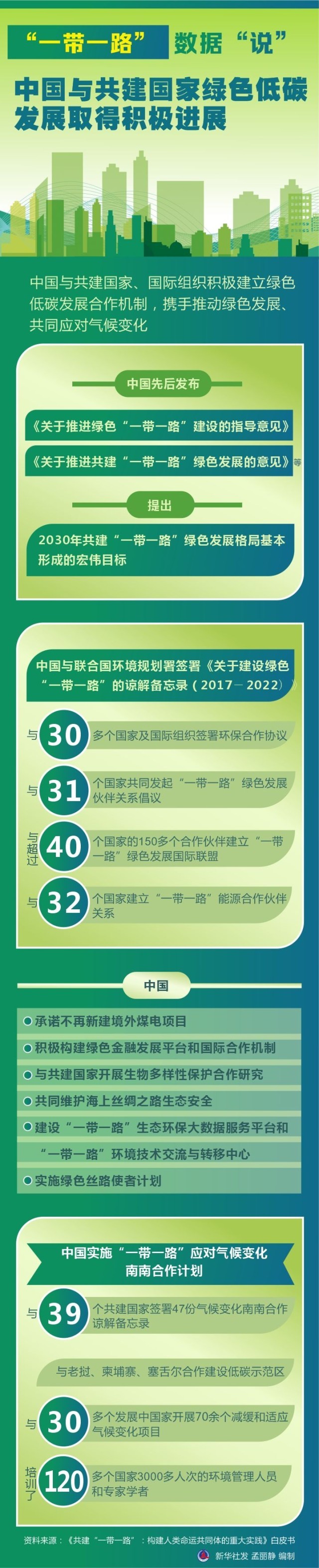 綠色低碳發(fā)展取得積極進展。中國與共建國家、國際組織積極建立綠色低碳發(fā)展合作機制,攜手推動綠色發(fā)展、共同應(yīng)對氣候變化。中國先后發(fā)布《關(guān)于推進綠色“一帶一路”建設(shè)的指導(dǎo)意見》《關(guān)于推進共建“一帶一路”綠色發(fā)展的意見》等,提出2030年共建“一帶一路”綠色發(fā)展格局基本形成的宏偉目標(biāo)。