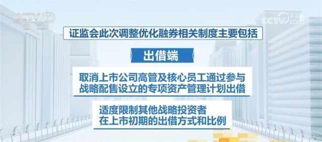 證監(jiān)會(huì)此次調(diào)整優(yōu)化融券相關(guān)制度主要包括:融券端,將融券保證金比例由不得低于50%上調(diào)至80%,對(duì)私募證券投資基金參與融券的保證金比例上調(diào)至100%;出借端,取消上市公司高管及核心員工通過(guò)參與戰(zhàn)略配售設(shè)立的專項(xiàng)資產(chǎn)管理計(jì)劃出借,適度限制其他戰(zhàn)略投資者在上市初期的出借方式和比例。