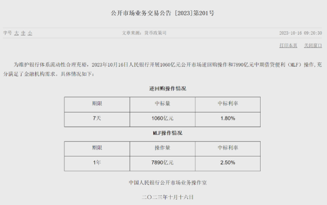 為維護銀行體系流動性合理充裕,10月16日中國人民銀行開展1060億元公開市場逆回購操作和7890億元中期借貸便利(MLF)操作,充分滿足了金融機構需求。
