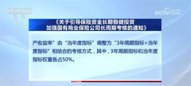 《通知》明確,為引導(dǎo)國有商業(yè)保險(xiǎn)公司長期穩(wěn)健經(jīng)營,更好發(fā)揮中長期資金的市場穩(wěn)定器和經(jīng)濟(jì)發(fā)展助推器作用,加強(qiáng)對(duì)國有商業(yè)保險(xiǎn)公司的長周期考核,根據(jù)《財(cái)政部關(guān)于印發(fā)<商業(yè)保險(xiǎn)公司績效評(píng)價(jià)辦法>的通知》,將經(jīng)營效益指標(biāo)的“凈資產(chǎn)收益率”由“當(dāng)年度指標(biāo)”調(diào)整為“3年周期指標(biāo)+當(dāng)年度指標(biāo)”相結(jié)合的考核方式,其中,3年周期指標(biāo)和當(dāng)年度指標(biāo)權(quán)重各占50%。