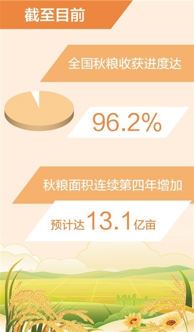 本報(bào)北京11月11日電 (記者郁靜嫻)農(nóng)業(yè)農(nóng)村部最新農(nóng)情調(diào)度顯示:伴隨玉米大豆及中稻收獲進(jìn)入尾聲、南方晚稻收獲加速推進(jìn),全國秋糧收獲進(jìn)度達(dá)96.2%,基本實(shí)現(xiàn)豐收到手。今年以來,我國糧食生產(chǎn)克服局部地區(qū)洪澇干旱等災(zāi)害影響,全年糧食產(chǎn)量有望再創(chuàng)新高。