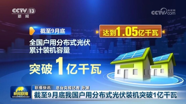 截至9月底,全國戶用分布式光伏累計裝機(jī)容量突破1億千瓦,達(dá)到1.05億千瓦。今年前9個月,全國戶用分布式光伏新增裝機(jī)3297.7萬千瓦,是去年全年的1.3倍。