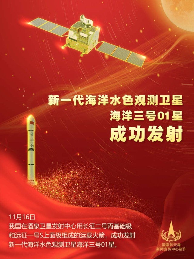中國青年報客戶端北京11月16日電(張未 王豪 李儀 中青報·中青網(wǎng)記者 邱晨輝)北京時間11月16日11時55分,我國在酒泉衛(wèi)星發(fā)射中心用長征二號丙基礎(chǔ)級和遠征一號S上面級組成的運載火箭,成功發(fā)射新一代海洋水色觀測衛(wèi)星海洋三號01星。該衛(wèi)星指標(biāo)達到國際水色遙感衛(wèi)星先進水平,可滿足我國海洋環(huán)境監(jiān)測的主體業(yè)務(wù)需求,并能夠服務(wù)于生態(tài)文明建設(shè)、智慧海洋工程建設(shè)、“一帶一路”倡議等國家重大戰(zhàn)略需求。