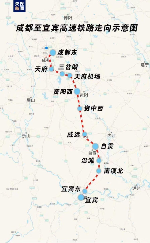 成都至宜賓高速鐵路由新建成都東至宜賓東高速鐵路(以下簡稱“成宜高鐵”)和新建重慶至昆明高速鐵路宜賓東至宜賓(以下簡稱“渝昆高鐵宜賓段”)組成。線路北起成宜高鐵成都東站,止于渝昆高鐵宜賓站。成都至宜賓高速鐵路為雙線高速鐵路,全線共設(shè)成都東、天府、三岔湖、天府機(jī)場、資陽西、資中西、威遠(yuǎn)、自貢、沿灘、南溪北、宜賓東、宜賓等12個(gè)車站,其中成都東和自貢站為既有站,天府站為緩開站。