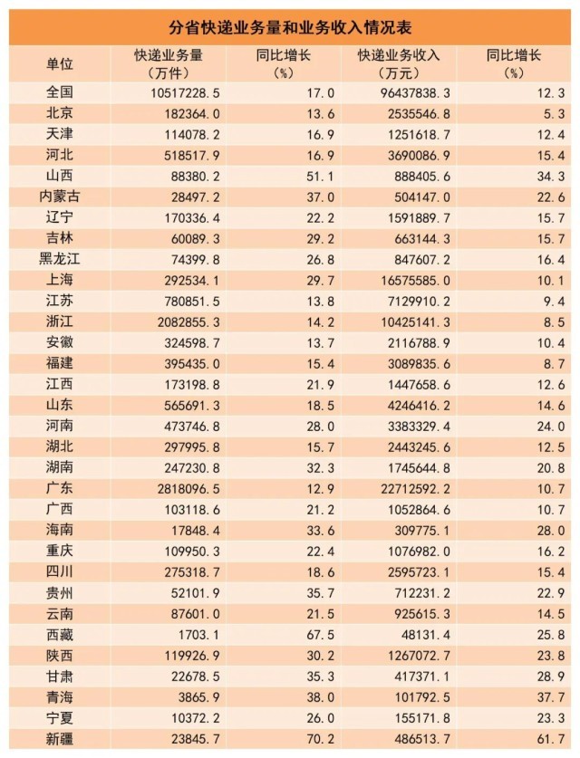 1-10月,郵政行業(yè)業(yè)務收入(不包括郵政儲蓄銀行直接營業(yè)收入)累計完成12351.5億元,同比增長11.5%。其中,快遞業(yè)務收入累計完成9643.8億元,同比增長12.3%。