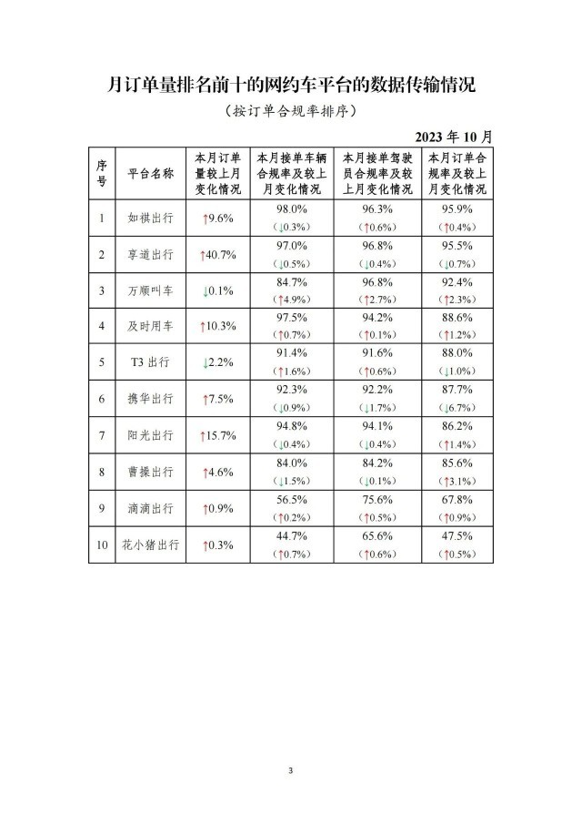 一、在訂單量前10名的網(wǎng)約車平臺(tái)中,訂單合規(guī)率最高的是如祺出行,最低的是花小豬出行。在訂單量前10名的平臺(tái)中,按訂單合規(guī)率(指駕駛員和車輛均獲得許可的訂單量占比)從高到低的分別是如祺出行、享道出行、萬(wàn)順叫車、及時(shí)用車、T3出行、攜華出行、陽(yáng)光出行、曹操出行、滴滴出行、花小豬出行。本月訂單合規(guī)率增長(zhǎng)前3名的依次是曹操出行、萬(wàn)順叫車、陽(yáng)光出行;增長(zhǎng)最后3名的依次是享道出行(-0.7%)、T3出行(-1.0%)、攜華出行(-6.7%)。