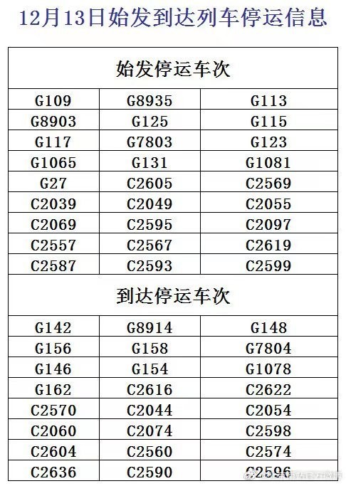 據(jù)北京西站官方微博今天中午最新消息,受降雪影響,12月13日,北京西站G57、G807、G97次列車臨時停運,北京豐臺站G63、G629次列車臨時停運。今天早上,北京西站、北京豐臺站已發(fā)布部分停運列車信息。已購買停運列車車票的旅客,可于30日內(nèi)辦理全額退票手續(xù)。請廣大旅客合理安排出行,關注車站公告或12306網(wǎng)站信息。
