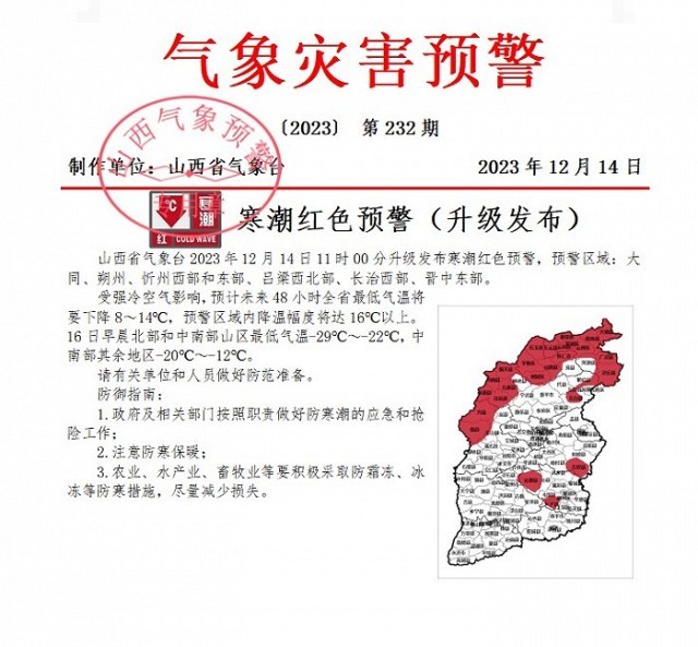 央視網(wǎng)消息:山西省氣象臺2023年12月14日11時00分升級發(fā)布寒潮紅色預(yù)警,預(yù)警區(qū)域:大同、朔州、忻州西部和東部、呂梁西北部、長治西部、晉中東部。受強冷空氣影響,預(yù)計未來48小時全省最低氣溫將要下降8~14°C,預(yù)警區(qū)域內(nèi)降溫福度將達16°C以上。16日早晨北部和中南部山區(qū)最低氣溫-29°C~-22°C,中南部其余地區(qū)-20°C~-12°C。