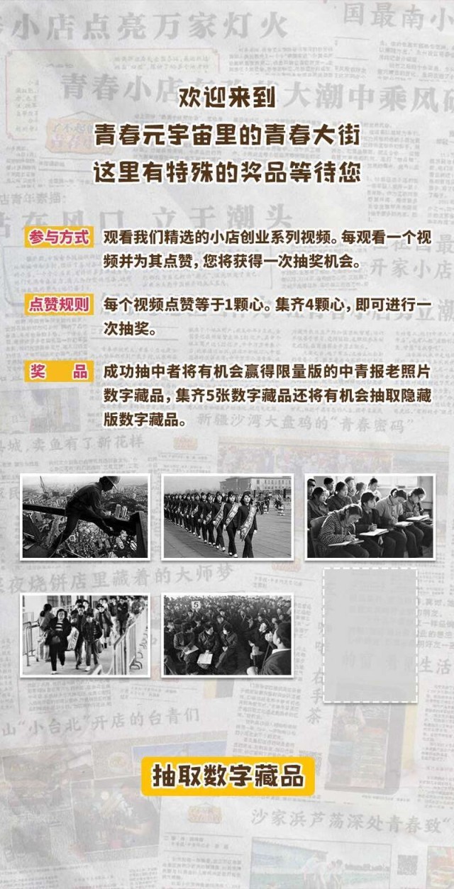 奔跑在青春大街上的青小豹邀請(qǐng)讀者一起玩尋找小店的游戲,大家可以邊體驗(yàn)邊觀看一個(gè)個(gè)小店和店主的故事,參加愛心點(diǎn)贊,還可以參與抽獎(jiǎng)。獎(jiǎng)品是用區(qū)塊鏈技術(shù)創(chuàng)制的數(shù)字藏品——改革開放45年以來中國青年報(bào)拍攝的精彩照片。