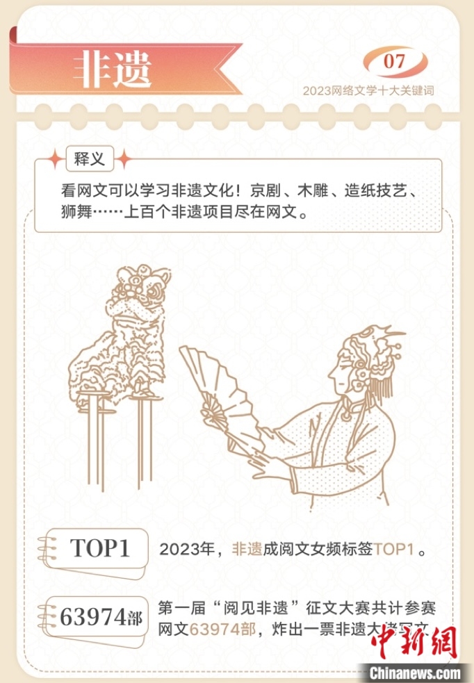 與此同時,網(wǎng)絡文學在高質量傳承傳統(tǒng)文化方面持續(xù)發(fā)力。京劇、木雕、造紙、獅舞……上百個非遺項目在網(wǎng)文中掀起“傳統(tǒng)文化熱”,“非遺”躍升為閱文女頻標簽TOP1。
