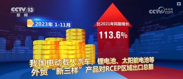 2023年1—11月,中國對RCEP成員國的中間品出口,比2021年同期增長17.4%,中國成為區(qū)域內最大的中間品貿(mào)易國。2023年1—11月,我國電動載人汽車、鋰電池、太陽能電池等外貿(mào)“新三樣”產(chǎn)品對RCEP區(qū)域出口總額,比2021年同期增長113.6%。