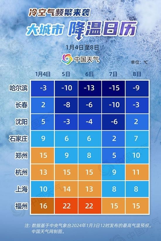 從這份大城市降溫日歷來看,5日開始,受冷空氣影響,降溫將自北向南展開,東北地區(qū)降溫最猛且連降三天,沈陽、長春的最高氣溫將重回冰點(diǎn)之下。近期已成為旅游熱門地的哈爾濱,降溫最為猛烈,6日至7日,最低氣溫將在-25℃左右,最高氣溫跌至近期低點(diǎn),達(dá)-15℃左右,天寒地凍一整天。近期有計(jì)劃去當(dāng)?shù)赜瓮娴哪戏叫』锇閭?,一定要帶好厚衣服,戶外活?dòng)帽子、手套、雪地靴從頭到腳捂嚴(yán)實(shí)。