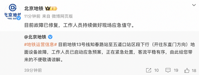 北京地鐵:13號線故障已修復