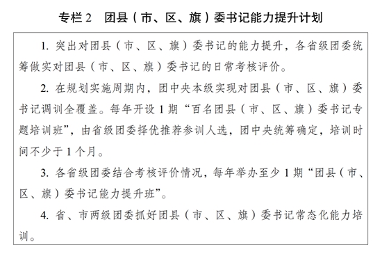 ?。ǘ┩怀觥瓣P(guān)鍵少數(shù)”政治訓(xùn)練。堅(jiān)持把政治訓(xùn)練貫穿團(tuán)干部成長全周期,使團(tuán)干部的政治素養(yǎng)、政治能力與擔(dān)負(fù)的領(lǐng)導(dǎo)職責(zé)相匹配。強(qiáng)化“一把手”政治培訓(xùn),有計(jì)劃地選調(diào)團(tuán)的各級領(lǐng)導(dǎo)機(jī)關(guān)主要負(fù)責(zé)同志到團(tuán)干部教育培訓(xùn)機(jī)構(gòu)參加專題培訓(xùn)。強(qiáng)化對團(tuán)縣(市、區(qū)、旗)委書記這一群體的培訓(xùn),實(shí)施團(tuán)縣(市、區(qū)、旗)委書記能力提升計(jì)劃(專欄2)。突出對團(tuán)的領(lǐng)導(dǎo)機(jī)關(guān)干部的政治訓(xùn)練,各級團(tuán)的領(lǐng)導(dǎo)機(jī)關(guān)加強(qiáng)對機(jī)關(guān)干部的常態(tài)化政治能力培訓(xùn)。加強(qiáng)對青年人才的政治引領(lǐng),團(tuán)中央組織部會同有關(guān)單位每年組織一定數(shù)量青年人才開展國情研修。積極推動將地方團(tuán)的領(lǐng)導(dǎo)機(jī)關(guān)班子成員培訓(xùn)納入地方黨委組織開展的干部政治理論培訓(xùn)范疇。