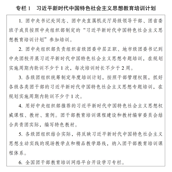 ?。ㄒ唬┚劢咕哿?,久久為功。完善團(tuán)干部理論教育培訓(xùn)長效機(jī)制,落實(shí)黨的創(chuàng)新理論學(xué)習(xí)教育計(jì)劃,組織實(shí)施習(xí)近平新時(shí)代中國特色社會主義思想教育培訓(xùn)計(jì)劃(專欄1),系統(tǒng)謀劃、持續(xù)用力,不斷把思想鑄魂、理論武裝工作引向深入。堅(jiān)持把習(xí)近平新時(shí)代中國特色社會主義思想作為團(tuán)的各級領(lǐng)導(dǎo)機(jī)關(guān)班子成員理論學(xué)習(xí)中心組學(xué)習(xí)首要內(nèi)容,作出具體安排、精心組織實(shí)施;作為各級團(tuán)干部教育培訓(xùn)機(jī)構(gòu)的主課必修課,辦好理論進(jìn)修班、理論研修班;作為團(tuán)干部學(xué)習(xí)的中心內(nèi)容,全面系統(tǒng)學(xué)、持續(xù)深入學(xué)、聯(lián)系實(shí)際學(xué)。以縣處級及以上團(tuán)干部為重點(diǎn),開展習(xí)近平新時(shí)代中國特色社會主義思想和黨的二十大精神集中輪訓(xùn);深入開展主題教育,通過專題學(xué)習(xí)、研討交流、主題黨課、調(diào)查研究、建章立制等形式,推動黨的創(chuàng)新理論學(xué)習(xí)教育走深走實(shí)走心,使廣大團(tuán)干部更加深刻領(lǐng)悟“兩個確立”的決定性意義,更加自覺增強(qiáng)“四個意識”、堅(jiān)定“四個自信”、做到“兩個維護(hù)”。深入開展習(xí)近平總書記關(guān)于青年工作的重要思想學(xué)習(xí)培訓(xùn),使廣大團(tuán)干部學(xué)習(xí)掌握黨的青年工作的地位作用、目標(biāo)任務(wù)、職責(zé)使命、實(shí)踐要求,為做好新時(shí)代新征程黨的青年工作打牢思想基礎(chǔ)。