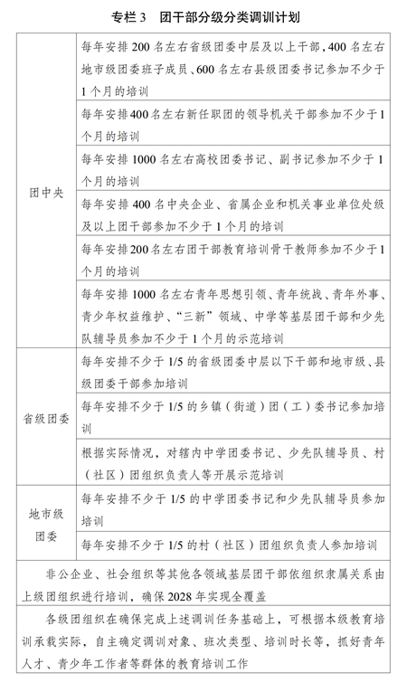 ?。ǘ﹫?jiān)持分級分類。根據(jù)各級團(tuán)的領(lǐng)導(dǎo)機(jī)關(guān)干部、高校團(tuán)干部、國有企業(yè)和機(jī)關(guān)事業(yè)單位單位團(tuán)干部、中學(xué)團(tuán)干部、鄉(xiāng)鎮(zhèn)(街道)團(tuán)(工)委書記、村(社區(qū))團(tuán)組織負(fù)責(zé)人、非公企業(yè)、社會組織等其他各領(lǐng)域基層團(tuán)干部的不同對象特點(diǎn),把團(tuán)干部履職能力培訓(xùn)的普遍性要求與不同類別、不同層級、不同崗位團(tuán)干部的特殊需要結(jié)合起來,整合優(yōu)質(zhì)資源,加強(qiáng)團(tuán)干部教育培訓(xùn)機(jī)構(gòu)與黨校(行政學(xué)院)、干部學(xué)院、黨性教育基地等的合作聯(lián)動,多渠道多方面開展履職能力培訓(xùn),切實(shí)增強(qiáng)教育培訓(xùn)的時(shí)代性、系統(tǒng)性、針對性、有效性。發(fā)揮中央團(tuán)校、全國青少年井岡山革命傳統(tǒng)教育基地主體作用,圍繞黨的中心任務(wù)、黨中央重大決策部署和國家重大戰(zhàn)略需求開展專題培訓(xùn);發(fā)揮全國團(tuán)干部教育培訓(xùn)基地優(yōu)勢,開展政策解讀、重點(diǎn)任務(wù)落實(shí)等專題培訓(xùn);發(fā)揮地方團(tuán)干部教育培訓(xùn)機(jī)構(gòu)優(yōu)勢,開展基層團(tuán)干部實(shí)務(wù)培訓(xùn);發(fā)揮全國團(tuán)干部教育培訓(xùn)網(wǎng)絡(luò)平臺作用,抓好履職通識培訓(xùn);加強(qiáng)與派出單位、接收單位的協(xié)作,抓好援派幫扶干部人才、掛職干部等教育培訓(xùn)。積極創(chuàng)造條件,支持干部在職自學(xué)。實(shí)施團(tuán)干部分級分類調(diào)訓(xùn)計(jì)劃(專欄3)。
