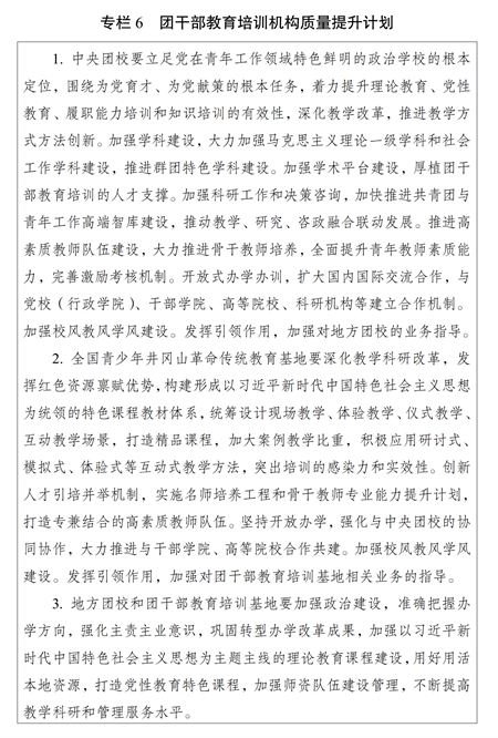?。ㄒ唬┡嘤?xùn)機(jī)構(gòu)建設(shè)。加強(qiáng)團(tuán)干部教育培訓(xùn)機(jī)構(gòu)規(guī)范管理和質(zhì)量提升,推進(jìn)各級團(tuán)校、團(tuán)干部教育培訓(xùn)基地建設(shè),構(gòu)建以中央團(tuán)校、全國青少年井岡山革命傳統(tǒng)教育基地為龍頭,各級團(tuán)校、團(tuán)干部教育培訓(xùn)基地相互補(bǔ)充、布局合理、規(guī)范有序的培訓(xùn)機(jī)構(gòu)體系,強(qiáng)化中央團(tuán)校對地方團(tuán)校的業(yè)務(wù)指導(dǎo),不斷提高辦學(xué)水平。加強(qiáng)各類團(tuán)干部教育培訓(xùn)機(jī)構(gòu)規(guī)范管理,開展團(tuán)干部教育培訓(xùn)機(jī)構(gòu)辦學(xué)質(zhì)量評估。支持各地各級團(tuán)組織聯(lián)合開展培訓(xùn),鼓勵團(tuán)干部教育培訓(xùn)機(jī)構(gòu)開展區(qū)域協(xié)作交流,推動優(yōu)質(zhì)培訓(xùn)資源共建共享。實(shí)施團(tuán)干部教育培訓(xùn)機(jī)構(gòu)質(zhì)量提升計(jì)劃(專欄6)。