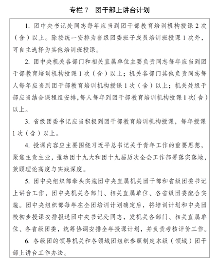 ?。ǘ熧Y隊(duì)伍建設(shè)。加大名師培養(yǎng)引進(jìn)力度,把團(tuán)干部教育培訓(xùn)師資納入各級青年人才政策支持范疇,努力造就一批對黨忠誠、精通黨的創(chuàng)新理論、授課水平高、在學(xué)科領(lǐng)域有影響力的知名教師。加強(qiáng)師資隊(duì)伍黨性教育和業(yè)務(wù)培訓(xùn),完善專職教師通過列席會議、基層調(diào)研、掛職鍛煉等方式促進(jìn)知識更新、加深理論研究。通過“名師帶徒”等方式,加強(qiáng)中青年骨干教師培養(yǎng)。大力推進(jìn)團(tuán)干部上講臺,實(shí)施團(tuán)干部上講臺計(jì)劃(專欄7)。注重在領(lǐng)導(dǎo)干部、先進(jìn)青年典型、優(yōu)秀基層團(tuán)干部中遴選培養(yǎng)師資。分級建設(shè)師資庫。探索建立符合團(tuán)干部教育培訓(xùn)特點(diǎn)的師資隊(duì)伍考核評價(jià)體系。
