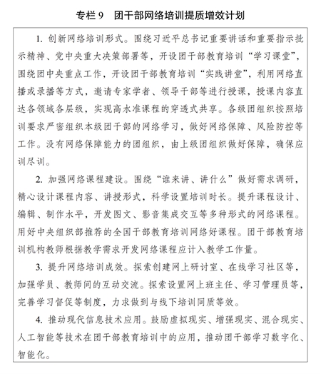 ?。ǘ┘訌?qiáng)網(wǎng)絡(luò)培訓(xùn)課程建設(shè)。鼓勵團(tuán)干部教育培訓(xùn)機(jī)構(gòu)開發(fā)精品網(wǎng)絡(luò)課程。注重把握網(wǎng)絡(luò)教學(xué)特點(diǎn)和規(guī)律,改進(jìn)授課方式,提高制作水平,豐富呈現(xiàn)形式,提升課程質(zhì)量。嚴(yán)把網(wǎng)絡(luò)課程政治關(guān)、質(zhì)量關(guān),規(guī)范講授、制作、審核、發(fā)布和更新、退出流程。充分發(fā)揮網(wǎng)絡(luò)培訓(xùn)優(yōu)勢,推動優(yōu)質(zhì)資源下基層。用好網(wǎng)絡(luò)直播培訓(xùn)形式,增強(qiáng)現(xiàn)場體驗(yàn)感。實(shí)施團(tuán)干部網(wǎng)絡(luò)培訓(xùn)提質(zhì)增效計(jì)劃(專欄9)。