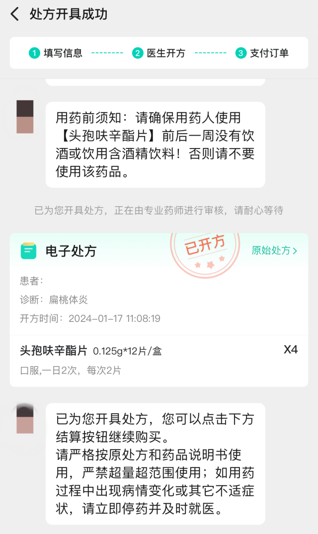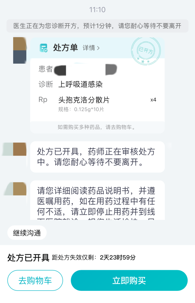 “您好,我是醫(yī)生XX,已收到您的復(fù)診開(kāi)藥訴求,正在為您診斷開(kāi)方,預(yù)計(jì)1分鐘,請(qǐng)不要離開(kāi)……”自動(dòng)發(fā)來(lái)三條問(wèn)話后,記者并未回復(fù)任何信息,一份電子處方就順利開(kāi)出。只需完成支付,處方藥就可以送貨上門。