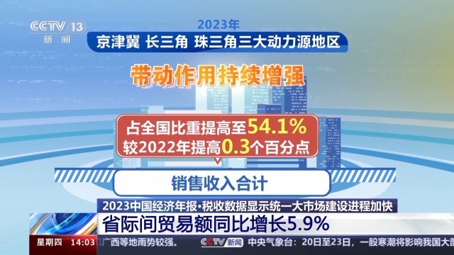 國家稅務(wù)總局新聞發(fā)言人 黃運(yùn):2023年,衡量國內(nèi)各省之間貿(mào)易聯(lián)系緊密程度的省際間貿(mào)易額同比增長(zhǎng)5.9%,占全國貿(mào)易總額比重提高至42.7%,較2022年提高0.5個(gè)百分點(diǎn),而且也呈逐年提升的態(tài)勢(shì),反映經(jīng)濟(jì)內(nèi)循環(huán)更加順暢,統(tǒng)一大市場(chǎng)建設(shè)進(jìn)程加快。