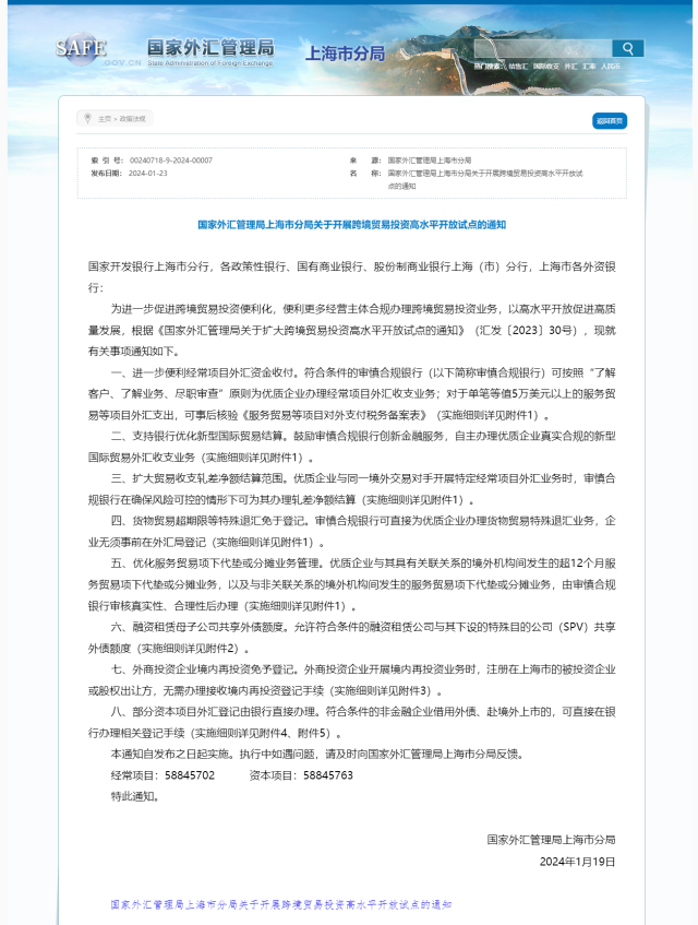 央視網(wǎng)消息:1月23日,國(guó)家外匯管理局上海市分局發(fā)布《關(guān)于開展跨境貿(mào)易投資高水平開放試點(diǎn)的通知》。