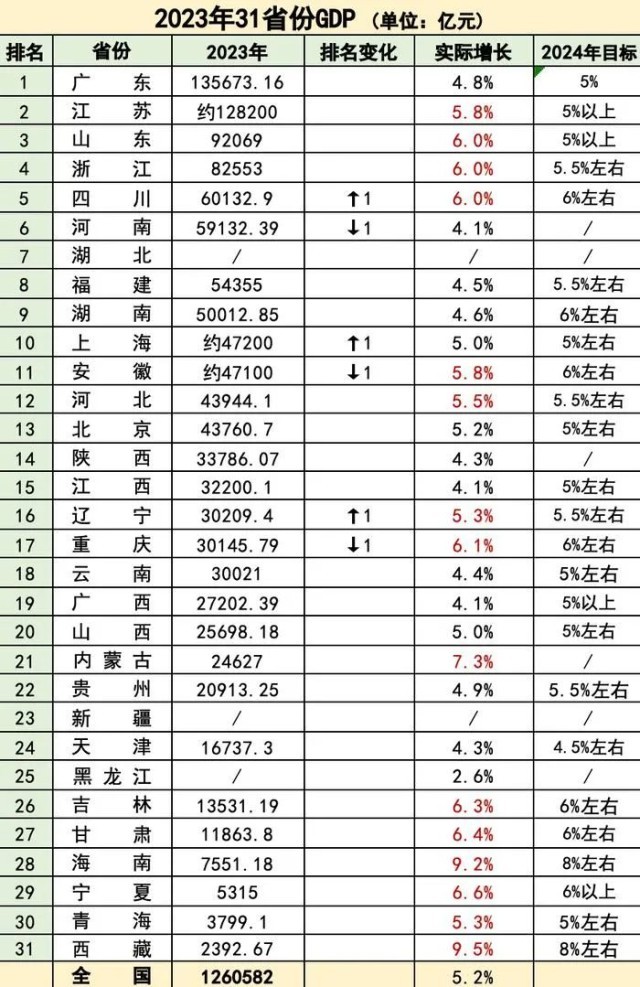 西藏、海南分別以9.5%、9.2%的增速領先,而在已公布數(shù)據(jù)的省份中黑龍江增速較低,為2.6%。值得一提的是,2023年,廣東、山東、四川、湖南等多個省份邁上各自的“萬億”新臺階,江蘇、山東、浙江等經(jīng)濟大省表現(xiàn)亮眼,扛起了增長的大旗。