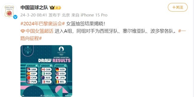 央視網(wǎng)消息:據(jù)中國(guó)籃球之隊(duì)官方微博消息,2024年巴黎奧運(yùn)會(huì)女籃抽簽結(jié)果揭曉!中國(guó)女籃進(jìn)入A組,同組對(duì)手為西班牙隊(duì)、塞爾維亞隊(duì)、波多黎各隊(duì)。