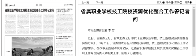 3月24日,《江西日報》發(fā)布了《省屬職業(yè)學(xué)校技工院校資源優(yōu)化整合工作答記者問》。