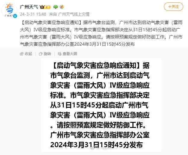 央視網(wǎng)消息:據(jù)廣州天氣 消息,據(jù)廣州市氣象臺監(jiān)測,廣州市達到啟動氣象災害(雷雨大風)Ⅳ級應(yīng)急響應(yīng)標準。市氣象災害應(yīng)急指揮部決定從31日15時45分起啟動廣州市氣象災害(雷雨大風)Ⅳ級應(yīng)急響應(yīng)。請按照預案規(guī)定做好防御工作。