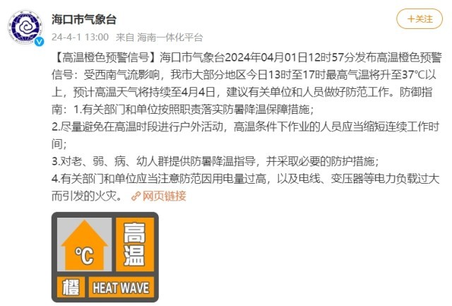 央視網(wǎng)消息:據(jù)@??谑袣庀笈_(tái) 微博消息,海口市氣象臺(tái)2024年04月01日12時(shí)57分發(fā)布高溫橙色預(yù)警信號(hào):受西南氣流影響,??谑写蟛糠值貐^(qū)今日13時(shí)至17時(shí)最高氣溫將升至37℃以上,預(yù)計(jì)高溫天氣將持續(xù)至4月4日,建議有關(guān)單位和人員做好防范工作。