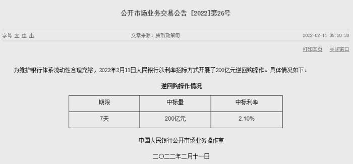 中新財(cái)經(jīng)2月11日電 為維護(hù)銀行體系流動(dòng)性合理充裕,2022年2月11日人民銀行以利率招標(biāo)方式開展了200億元逆回購(gòu)操作。中標(biāo)利率2.1%,與此前持平。