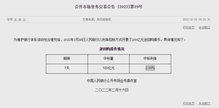 中新財(cái)經(jīng)2月16日電 16日,據(jù)中國人民銀行官網(wǎng)消息,為維護(hù)銀行體系流動性合理充裕,2022年2月16日人民銀行以利率招標(biāo)方式開展了100億元逆回購操作,中標(biāo)利率2.10%。(完)