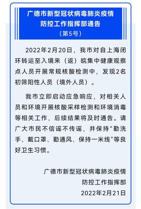 安徽廣德發(fā)現(xiàn)2名境外人員初篩陽(yáng)性人員