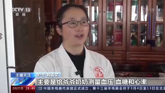 護(hù)士 楊春花:每個(gè)星期來一次的,主要是給爺爺奶奶測量血壓,血糖和心率,幫他做一下藥物的管理。