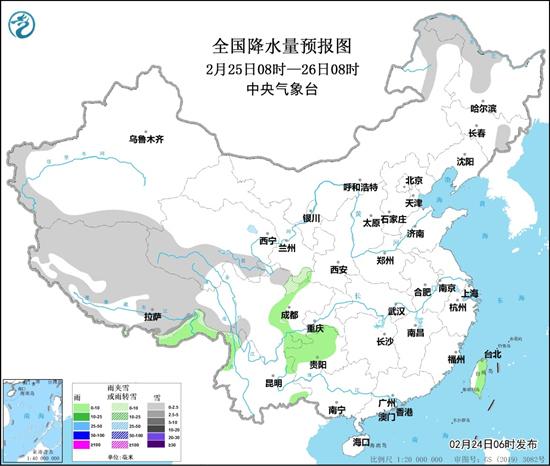 預(yù)計2月24日14時至25日14時,新疆南疆西部山區(qū)、西藏北部和西部、青海南部、川西高原東部等地部分道路受小雪或雨夾雪影響;西藏東南部、四川盆地西部、貴州西部、云南東北部等地部分道路受小雨影響;河北中部、浙江西南部、湖北東部和南部、湖南北部、貴州西部和東部、云南東部、四川盆地中部和西部等地部分道路受霧影響能見度低。