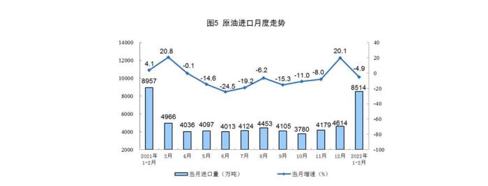 原油生產(chǎn)穩(wěn)定增長,進口由增轉降。1—2月份,生產(chǎn)原油3347萬噸,同比增長4.6%,增速比上年12月份加快2.9個百分點,日均產(chǎn)量56.7萬噸。進口原油8514萬噸,同比下降4.9%,上年12月份為增長20.1%。
