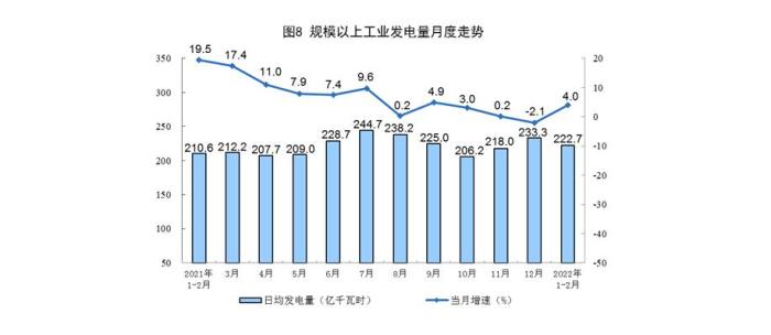 電力生產(chǎn)由降轉升。1—2月份,發(fā)電量13141億千瓦時,同比增長4.0%,上年12月份為下降2.1%,日均發(fā)電222.7億千瓦時。