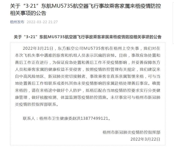 中新網3月22日電 據“梧州發(fā)布”微信公眾號消息,3月22日,梧州市新冠肺炎疫情防控指揮部發(fā)布通告稱,2022年3月21日,東方航空公司MU5735客機在梧州上空失事。目前,事故應急處置和善后工作正在進行,為保證應急處置和善后工作不受疫情影響,并妥善保障各方人員和乘客家屬的健康權益不受侵害,按照疫情防控管理有關規(guī)定,我們建議來自中高風險地區(qū)、新冠肺炎密切接觸者、事故乘客非直系親屬暫緩來梧,可與當?shù)靥幹蒙坪蠊ぷ鹘M聯(lián)系或委托其他未受疫情影響的家屬赴梧處理善后事宜。