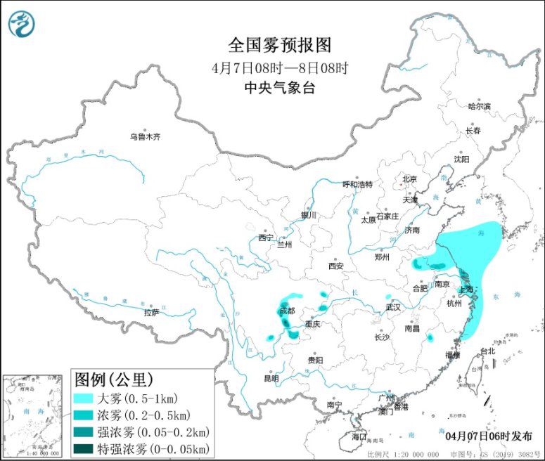 中新網(wǎng)4月7日電 據(jù)中央氣象臺(tái)網(wǎng)站消息,預(yù)計(jì)4月7日早晨至夜間,黃海中部和南部海域、東海西部海域、江蘇東部沿岸海域、長江口附近海域、浙江東部沿岸海域、福建東北部沿岸海域?qū)⒂心芤姸炔蛔?公里的大霧天氣。此外,7日早晨至上午,四川盆地西部和南部、重慶中部、安徽北部、江蘇北部和東部、上海、浙江東北部等地的部分地區(qū)有大霧天氣,局地有能見度不足500米的濃霧(見圖1)。為此,中央氣象臺(tái)7日6時(shí)繼續(xù)發(fā)布大霧黃色預(yù)警。7日至9日,西南地區(qū)多陰雨,西藏東南部、四川南部、云南中西部和北部、貴州西部等地有中到大雨。