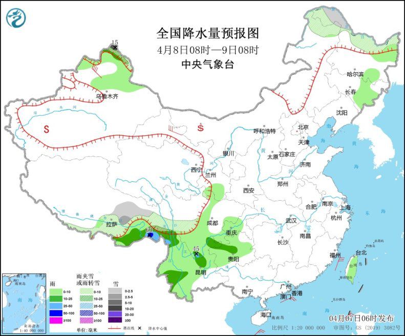 4月8日08時(shí)至9日08時(shí),新疆北疆北部、西藏東部、內(nèi)蒙古東北部、黑龍江北部等地的部分地區(qū)有小到中雪或夾雪,其中新疆北疆北部等地的部分地區(qū)有大雪,局地暴雨(10~15毫米);新疆北部、西藏東南部、黑龍江東部、吉林東部、甘肅南部、四川南部、重慶西部、貴州、云南等地的部分地區(qū)有小到中雨,其中云南北部、西藏東南部局地有大雨或暴雨(50~60毫米)。甘肅中西部、西北地區(qū)東北部、內(nèi)蒙古大部、東北地區(qū)中南部、山東半島、西藏中南部等地的部分地區(qū)有4~6級(jí)風(fēng)(見圖3)。