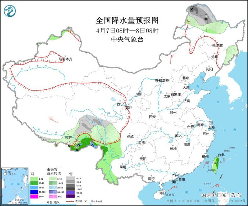 4月7日08時(shí)至8日08時(shí),新疆北疆北部、西藏東部、青海南部、川西高原西北部、內(nèi)蒙古東北部、黑龍江西北部和東南部、吉林東部等地的部分地區(qū)有小到中雪或雨夾雪,其中內(nèi)蒙古東北部、黑龍江西北部等地局地大雪(5~7毫米);西藏東南部、四川西南部、云南中西部及臺(tái)灣島等地的部分地區(qū)有小到中雨,其中西藏東南部等地局地大雨(25~45毫米)。內(nèi)蒙古中東部、西藏中南部等地的部分地區(qū)有4~6級(jí)風(fēng),其中西藏中部的部分地區(qū)有7~8級(jí)風(fēng)(見圖2)。
