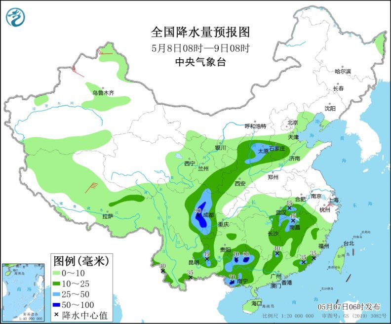 5月8日08時至9日08時,甘肅南部、陜西北部和西南部、山西中部、河北南部、四川盆地西部、貴州西部和南部、云南東部和南部、湖北東南部、江西、湖南東部和南部、廣西、廣東北部、福建南部等地的部分地區(qū)有中到大雨,其中,四川盆地西部和南部、廣西北部和南部等地局地暴雨(50~90毫米)。新疆北部、江南東部、西藏中北部等地的部分地區(qū)有4~6級風(見圖2)。